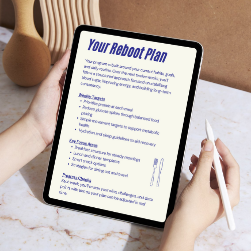 A deeper, more tailored reset for people who want a radical change in their body composition and habits. This is your personalised blueprint for stable blood sugar, better energy, and a body that finally cooperates. You’ll work with Benson one-on-one each week, so you stay accountable and keep moving forward even when life gets busy. Across twelve weeks, you’ll rebuild the foundation of your habits, dial in your meals, understand your patterns, and get support at every step. This is our most hands-on offer with customised plans and real-time adjustments based on your progress.